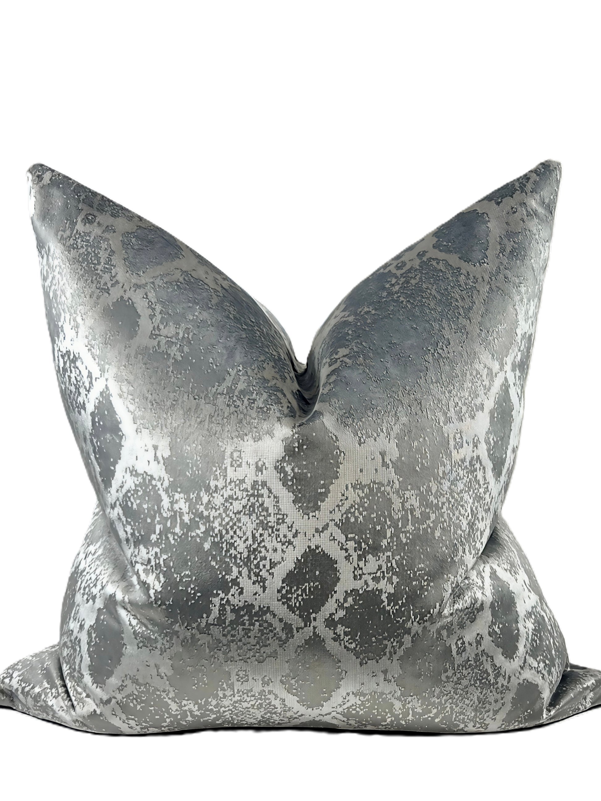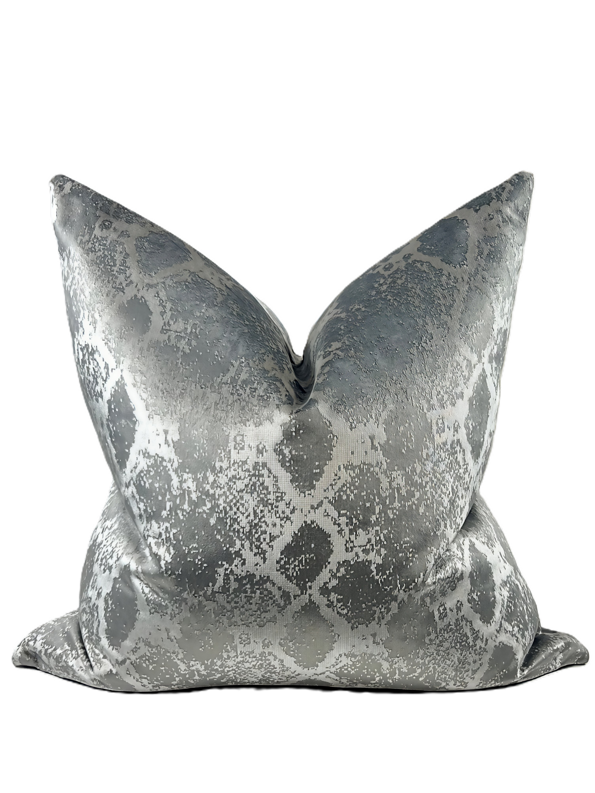 This decorative throw pillow features a luxurious metallic silver finish with a subtle, abstract pattern reminiscent of a modernized snakeskin texture. The surface showcases a beautiful blend of soft shimmer and matte detailing, giving the pillow rich visual depth and sophistication. Its cool gray‑silver tones create a sleek, contemporary look, making it an elegant accent for a wide range of décor styles.